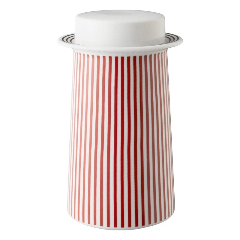 1616 / arita japanin PC-kokoelman teepurnukkaa koristaa soma punainen viivakuvio sekä kaksi mustaa rengasta purkin suuaukon ympärillä. Suunnittelijansa Pierre Charpinin mukaan nimetty PC-astiakokoelma perustuukin juuri muodon ja koristeen väliseen suhteeseen: usein koriste suunnitellaan valmista astiaa varten, mutta PC-kokoelman tapauksessa astiat ja koristeet on suunniteltu samanaikaisesti. Lopputuloksena on pelkistetty astiakokoelma, jonka ilme on samaan aikaan raikkaan moderni ja lempeän nostalginen. Kokoelma tunnetaan myös nimellä Outline.