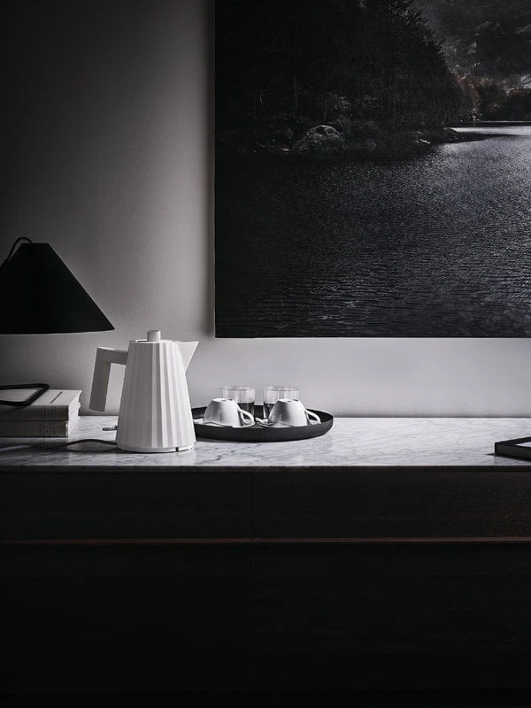 Alessin Plissé-vedenkeittimen muotokieleen on haettu inspiraatiota muotimaailmasta ja arkkitehtuurista: vedenkeittimen pintakuviointi muistuttaa vekitettyä kangasta, ja sen yleisilme on dynaamisen veistoksellinen. Michele De Lucchin vuonna 2018 suunnittelema Plissé sopii niin veden keittämiseen kuin tarjoiluunkin – lämpöeristetyn kannun voi huoletta laskea mille tahansa pöytäpinnalle. Vedenkeitin on varustettu kalkinpoistosuodattimella ja automaattisella turvakytkimellä, joka katkaisee virran, mikäli keittimen sisällä ei ole riittävästi vettä. Puhdistuksen helpottamiseksi sähkövastus on piilossa keittimen pohjassa.