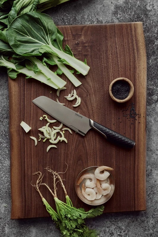 Fiskarsin Titanium-sarjan Santoku-veitsessä kohtaavat äärimmäisen terävä, ruostumaton ja kevyt titaaniterä sekä ergonomisesti muotoiltu, tukevasti käteen istuva kahva. Fiskarsin Titanium-kokoelman veitset on valmistettu ainutlaatuisella LZR-EDGE-teknologialla, jossa terä on vahvistettu titaanikarbidipäällysteellä – veitsen on näin todettu pysyvän terävänä neljä kertaa pidempään kuin perinteisten teräsveisten. Veisten terävyyttä mittaavassa CATRA-testissä Titanium-perheen veitset ovat saaneet korkeimman mahdollisen luokituksen. Muotoilultaan Titanium-veitset ovat paitsi funktionaalisia myös vähäeleisen tyylikkäitä ja niin koti- kuin ammattikäyttöön sopivia.