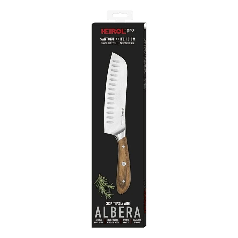 Heirolin Albera-sarjan Santoku-veitsi on kaunis puukahvainen keittiöveitsi, joka sopii hyvin keittiön yleisveitseksi.