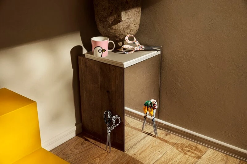 Fiskars X Iittala -sakset yhdistävät kaksi ikonista suomalaisbrändiä. Iittalan Oiva Toikka -kokoelmaan kuuluvat sakset vastaavat muodoltaan ja toiminnallisuudeltaan Fiskarsin klassikkosaksia, mutta tutun oranssin sävynsä sijaan ne saaneet ylleen Oiva Toikan graafisen Gepardi-kuvion. Sakset on valmistettu Suomessa.