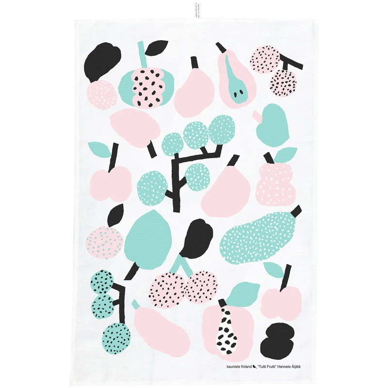 Kaunisteen Tutti Frutti -keittiöpyyhettä koristaa Hannele Äijälän suunnittelema herkullinen kuosi, jota rytmittävät omenat, päärynät, persikat sekä trooppiset ja mielikuvitukselliset hedelmät. Tukevasta pellava-puuvillakankaasta valmistettu keittiöpyyhe tuo keittiöön pirteän graafisen väriläiskän. Tutti Frutti -kuosi on painettu kankaalle silkkipainotekniikalla.
