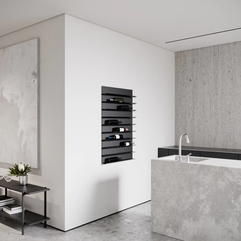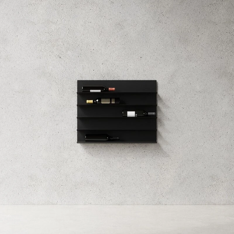 Nichban musta viinipulloteline on moderni säilytysratkaisu suosikkiviinipulloillesi ja lempikuohuviineillesi. Nichlas Bjørn Andersenin suunnittelema viinipulloteline on kevyen minimalistinen ja ilmava – aivan kuin se vain leijuisi seinällä, lähes painovoimaa uhmaten. Teräksestä valmistettu viinipulloteline sopii niin viinikellariin, keittiöön kuin ruokailutilan seinälle, ja on myös mainio lahjaidea viiniharrastelijalle. Telineen viidellä hyllyllä on tilaa yhteensä kymmenelle pullolle.