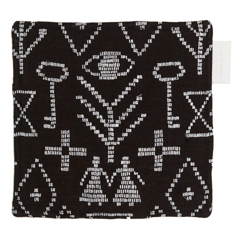 Saana ja Ollin Maailman synty -patalappu/pannunalunen on kuvioitu suomalaisesta ryijy- ja täkänäperinteestä vaikutteita ottaneella printillä. Ikiaikaisista luomismyyteistä poimitut symbolit ja hahmot asettuvat Maailman synty -kuosissa rytmikkääksi kokonaisuudeksi. Kaikki Saana ja Olli -tuotteet on valmistettu kestävästä sataprosenttisesta hamppukankaasta, joka on tuotettu Euroopassa. Tuotteet on valmistettu Suomessa kestävän kehityksen periaatteita kunnioittaen.