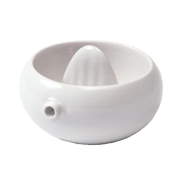 Tonfisk Designin Oma-sitruspuristimen pehmeälinjainen muotokieli ja valkoinen keramiikkapinta sopivat mainiosti osaksi juhlavaakin pöytäkattausta. Kekseliään muotoilun ja kaatonokan ansiosta sitruunamehu ei roisku puristettaessa, ja siemenet pysyvät visusti puristimen sisällä.